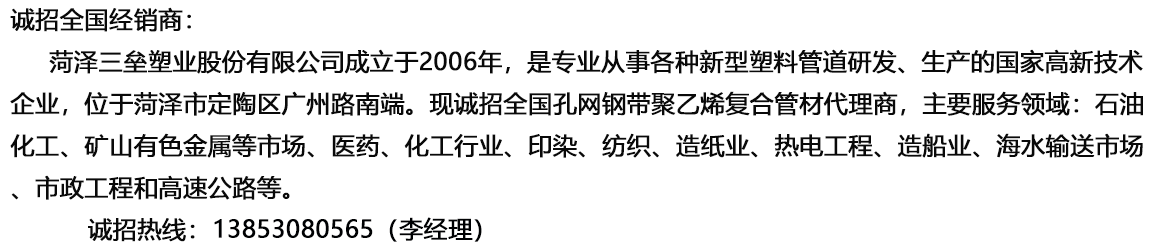 菏澤三壘塑業(yè)股份有限公司專業(yè)從事各種新型塑料管道研發(fā)和生產(chǎn),重點研發(fā)了孔網(wǎng)鋼帶聚乙烯復(fù)合管材